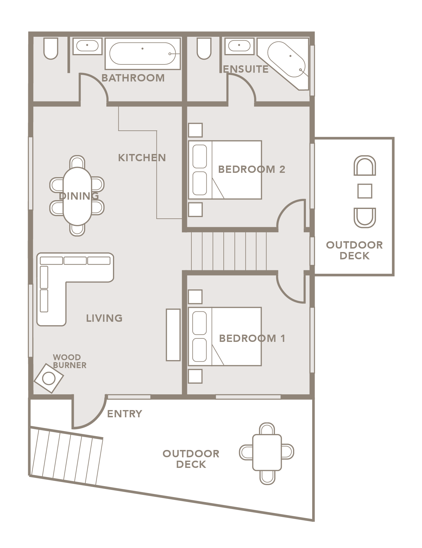 Upstairs is open plan with a wood burner, large deck, outdoor table seating, lounge & dining area, main bathroom and shower over bath, and a fully equipped kitchen.