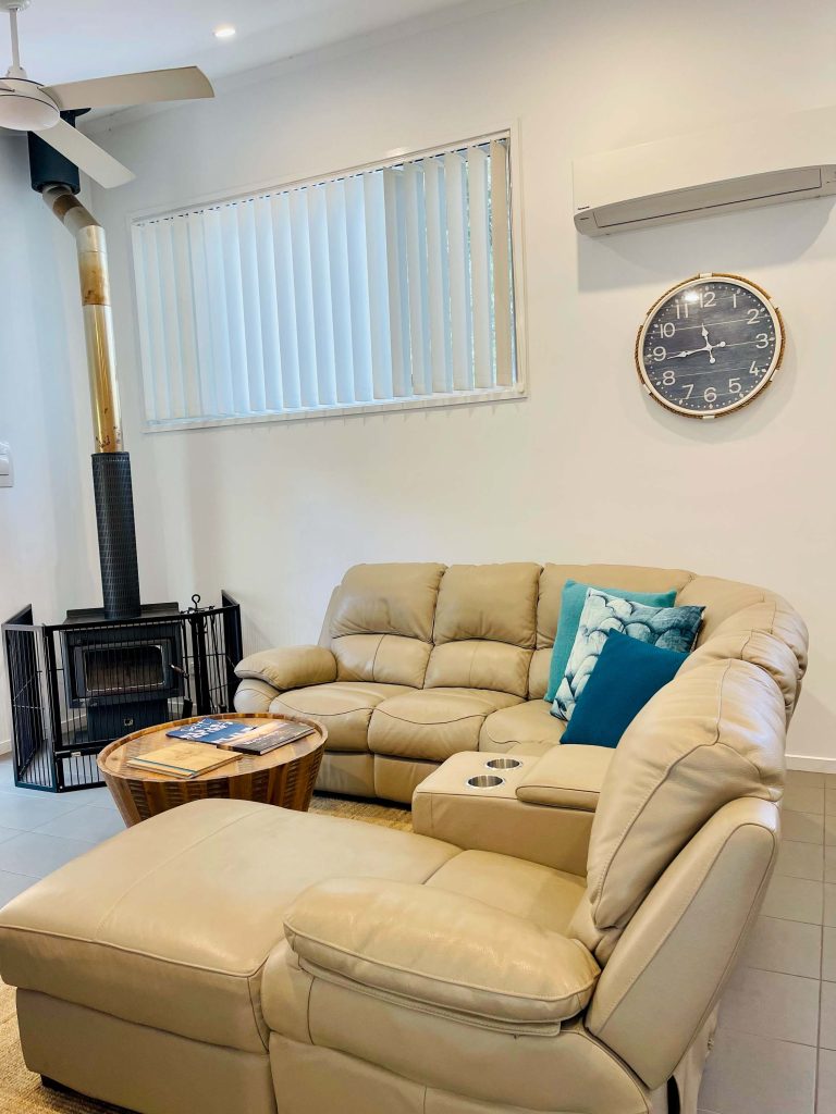 Downstairs has two bedrooms. The main bedroom features a spa bath in the ensuite, and a private deck where guests can relax overlooking the tranquil rainforest.