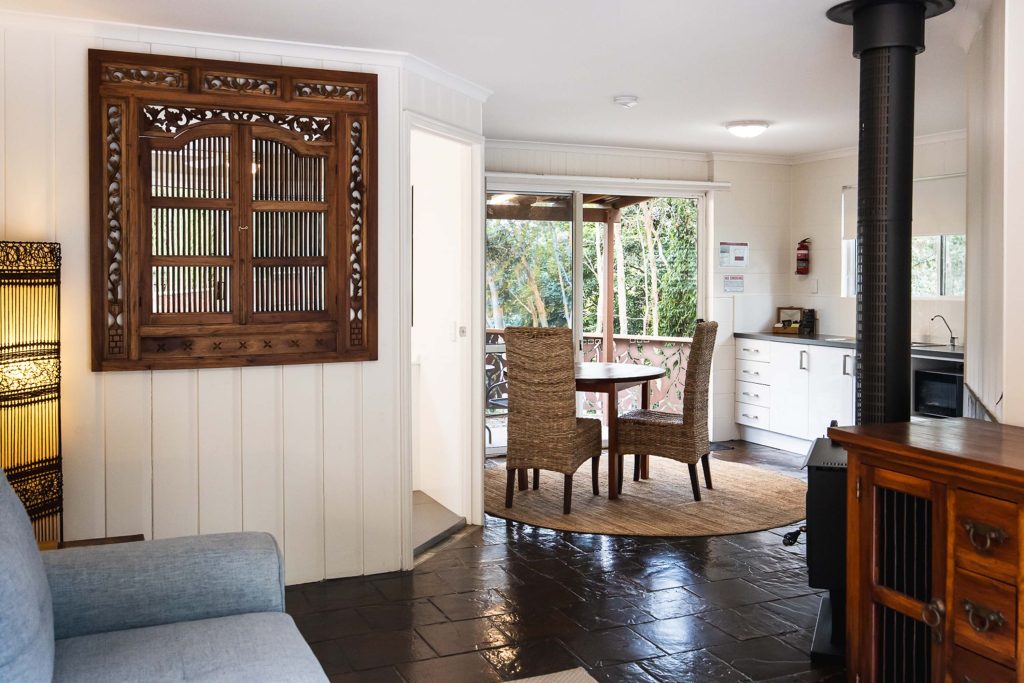 This duplex style studio offers 1 queen bed in the bedroom, a bathroom with walk-in shower, a small outdoor courtyard, and a wood burner for a cosy touch in the cooler months.