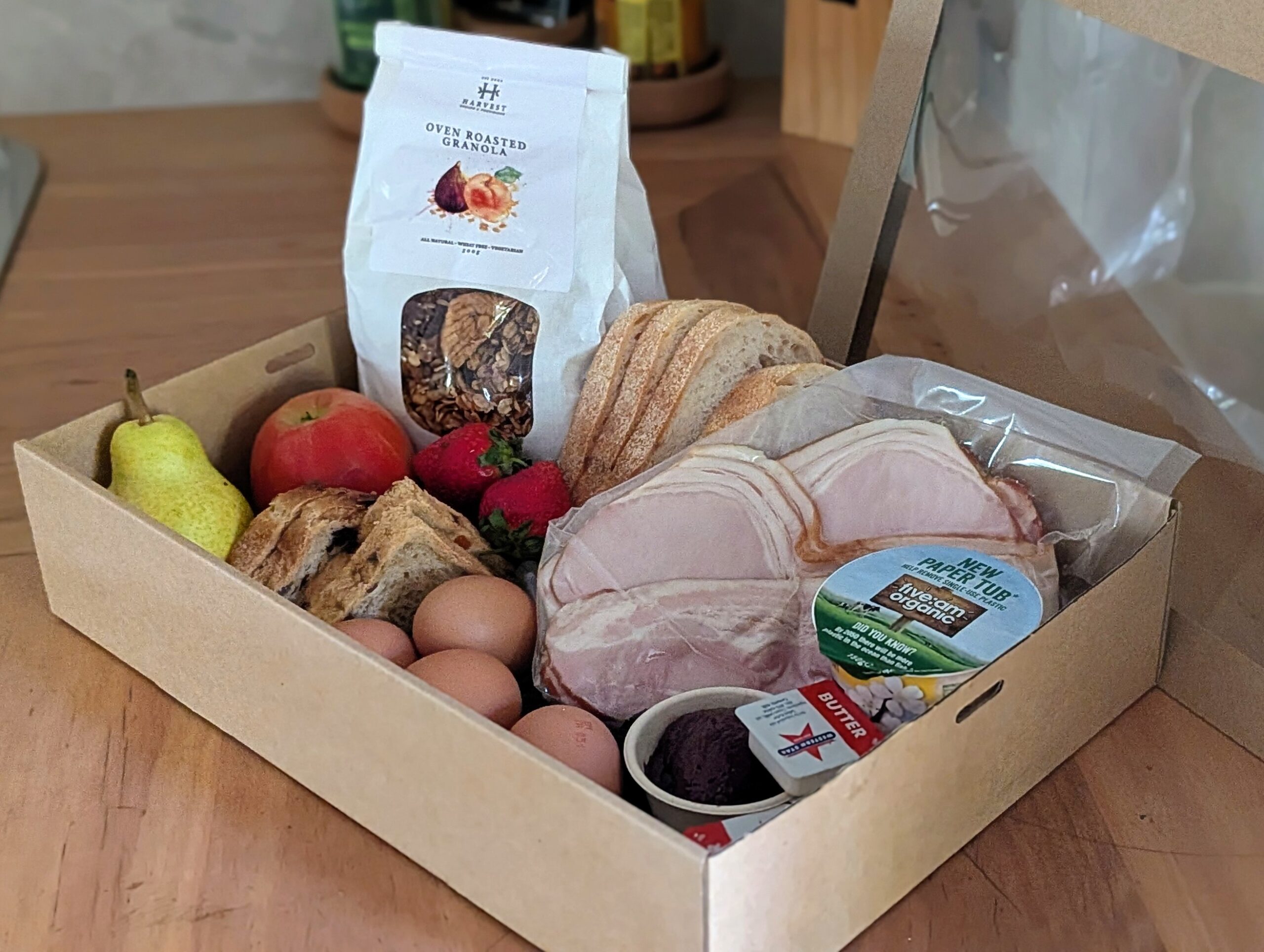 Sourdough Loaf & Fruit Toast, Premium Bacon, Free Range Eggs, Oven Roasted Granola, Natural Yogurt & Fresh Milk, Condiments - spreads & butter.